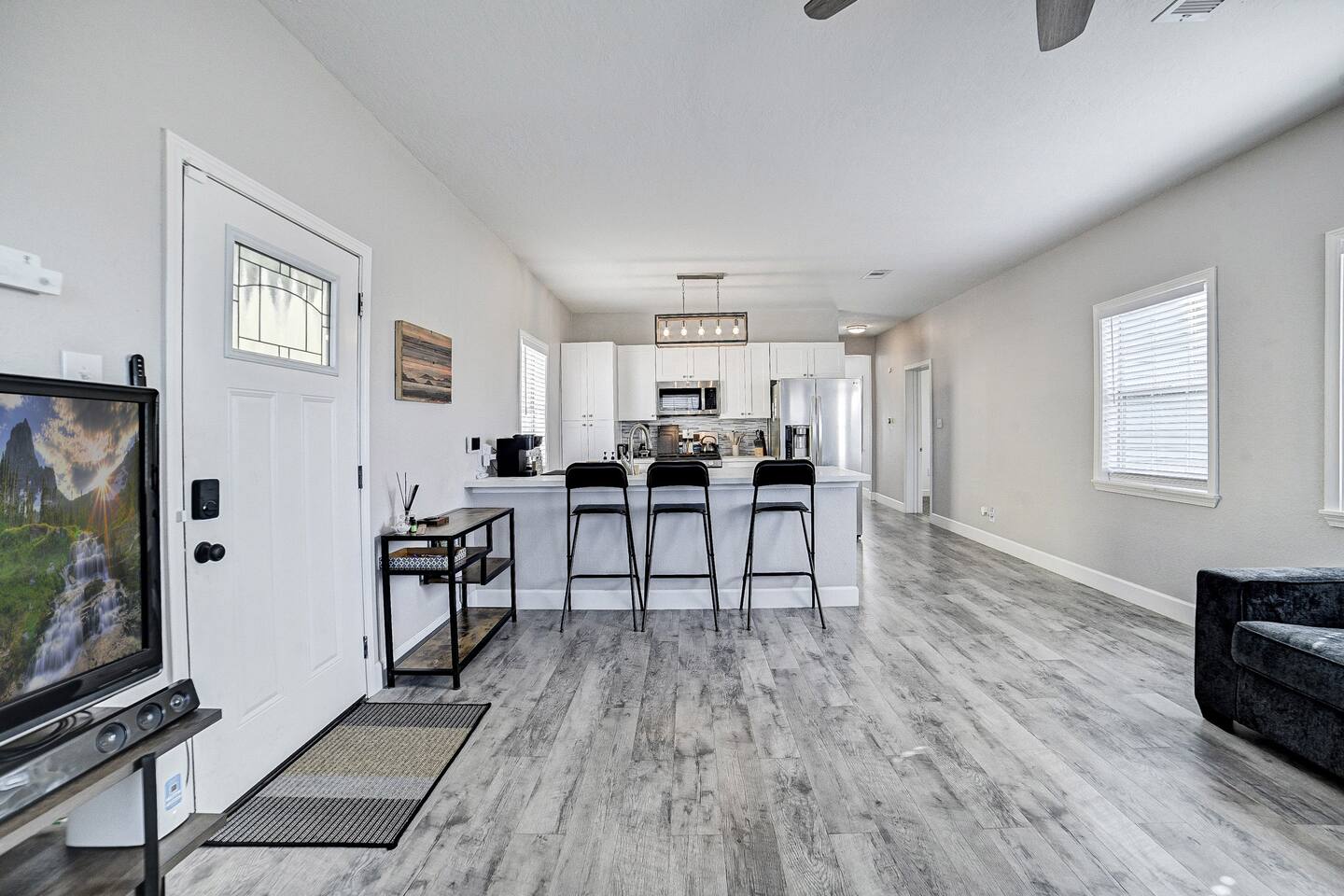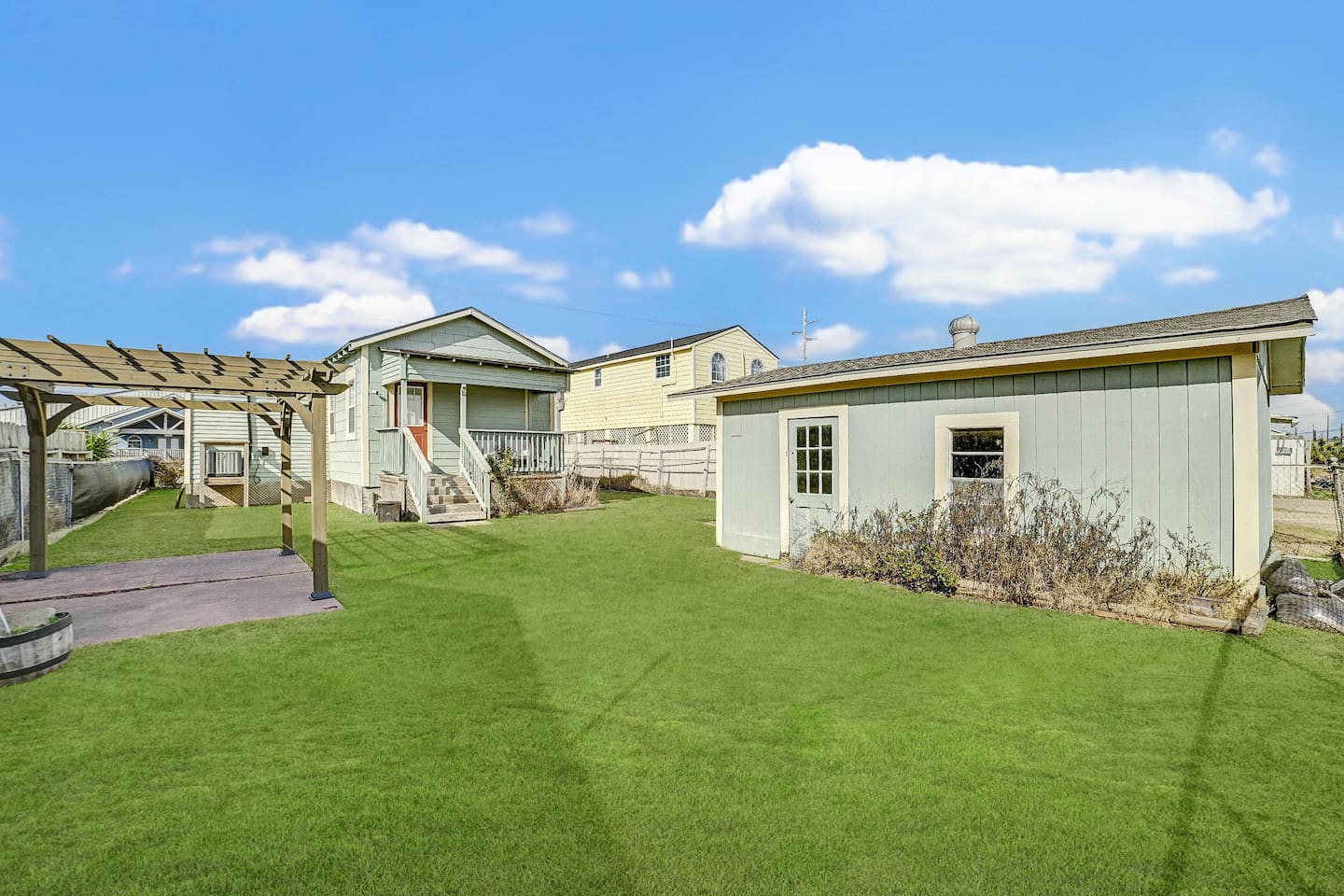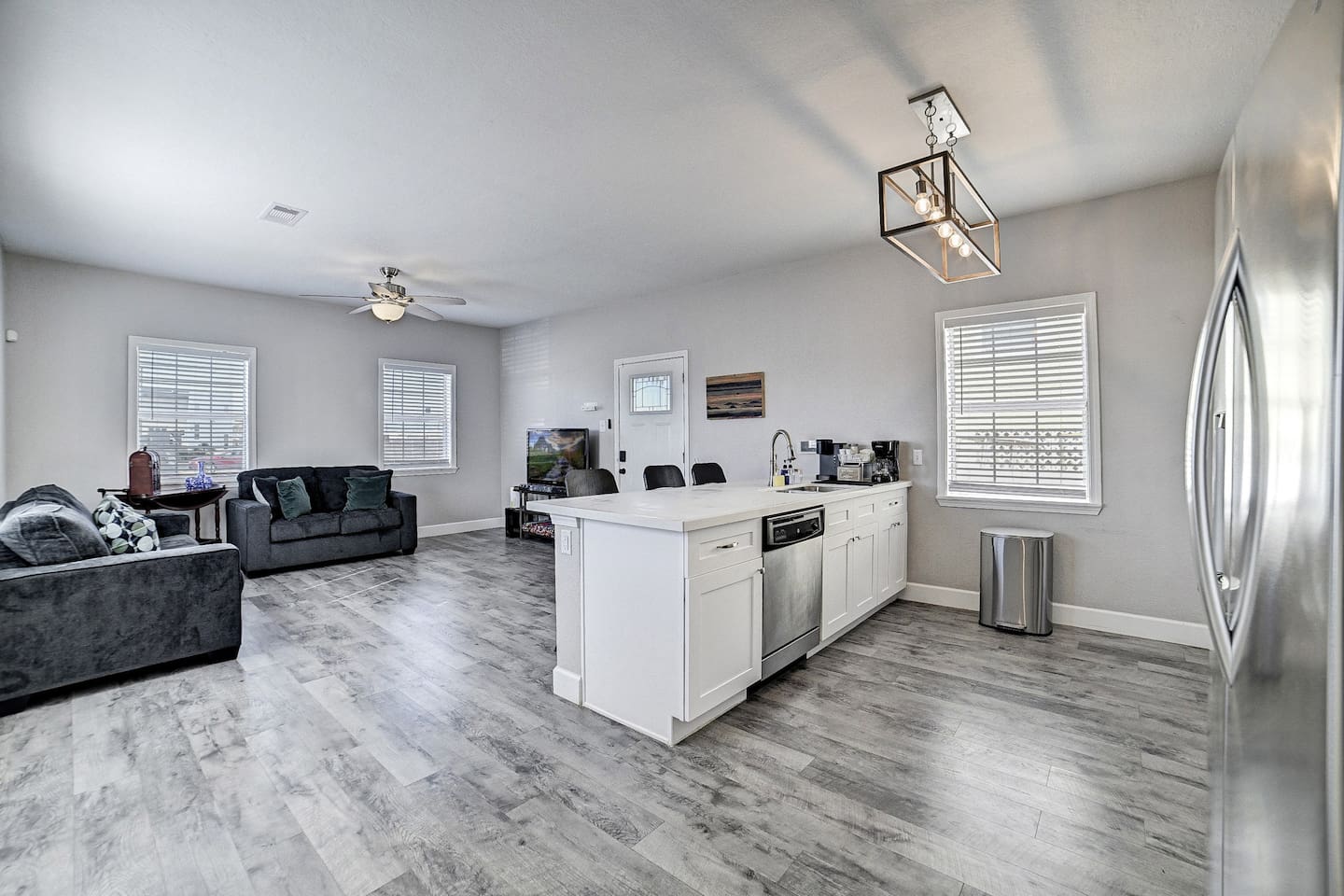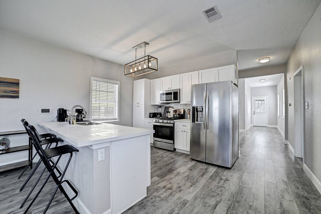 Conveniently located near popular restaurants, beaches, and island attractions, Bayou Bungalow offers the perfect balance of relaxation and accessibility for your Galveston getaway. Why Guests Love Bayou Bungalow • Comfortable 2-bedroom home sleeping up to 6 guests • Two full bathrooms – great for families or groups • Relaxing front porch seating • Fenced backyard + charcoal grill • Spacious kitchen island for cooking together • Pet-friendly outdoor space • Off-street parking for 2–3 cars Living Space The inviting living room is perfect for relaxing after a day exploring Galveston. Sink into the comfortable couch or loveseat and enjoy streaming your favorite shows on the Smart TV. The open layout and natural light create a welcoming space for gathering with family and friends. Kitchen & Dining The fully equipped kitchen is ideal for preparing meals during your stay. Features include: • Gas stovetop + oven • Spacious kitchen island for meal prep • Coffee bar with drip coffee maker, Keurig, and kettle • Blender, toaster, microwave, and cookware • Plates, bowls, mugs, and utensils for group meals Bar seating at the kitchen counter provides a casual dining area perfect for breakfast or evening drinks. Bedrooms The home offers two comfortable bedrooms plus a sofa bed, giving everyone their own space. Bedroom 1 • Queen bed • Amazon FireTV • Closet storage Bedroom 2 • Twin daybed with trundle • Amazon FireTV • Great for kids or additional guests Living Room • Sofa bed for extra sleeping space Bathrooms Bayou Bungalow includes two full bathrooms, which makes mornings and evenings easier for families or groups. • One bathroom with shower only • One bathroom with tub + shower combination (great for families) Fresh towels and essential toiletries are provided. Outdoor Space Enjoy the laid-back island lifestyle in two outdoor areas. Front Porch • Perfect for morning coffee or evening drinks • Relaxing seating with coastal breezes Backyard • Fenced yard ideal for dogs • Charcoal grill for cookouts • Outdoor seating area Perfect For • Families visiting Galveston • Beach weekend getaways • Couples traveling together • Guests bringing a dog • Cruise travelers looking for extra space