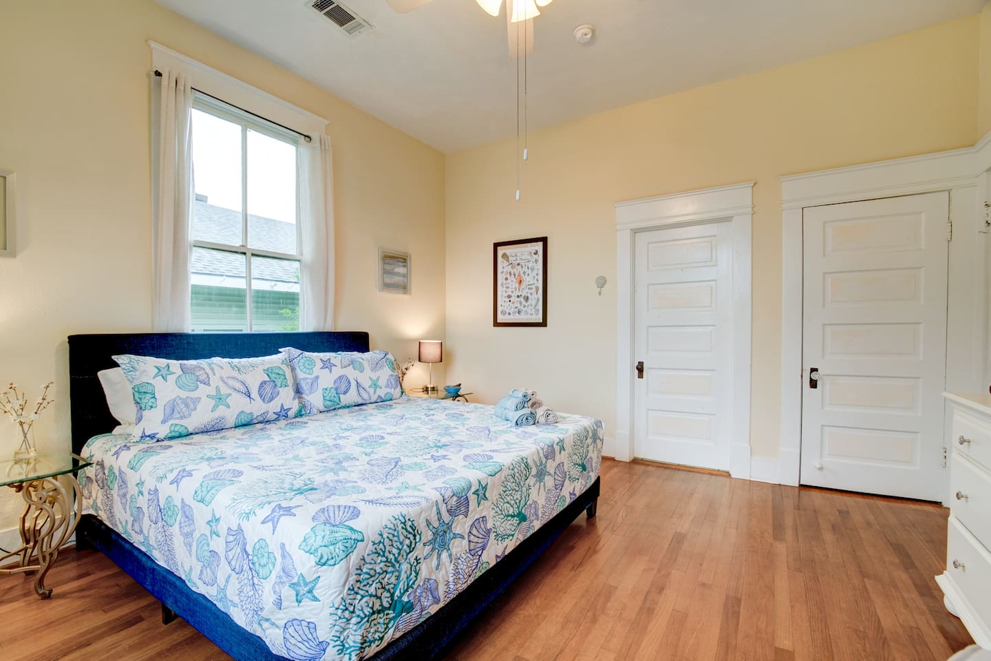 Welcome to Island Pride Bungalow, a charming Galveston getaway just a short walk from the Seawall, beach, and local restaurants. Perfect for families, couples, or small groups, this comfortable island home features two king bedrooms, a queen bedroom, a fenced yard for dogs, and a relaxing front porch to enjoy the Gulf breeze. Hosted by local Galveston residents, the home is thoughtfully equipped for both short getaways and longer stays.