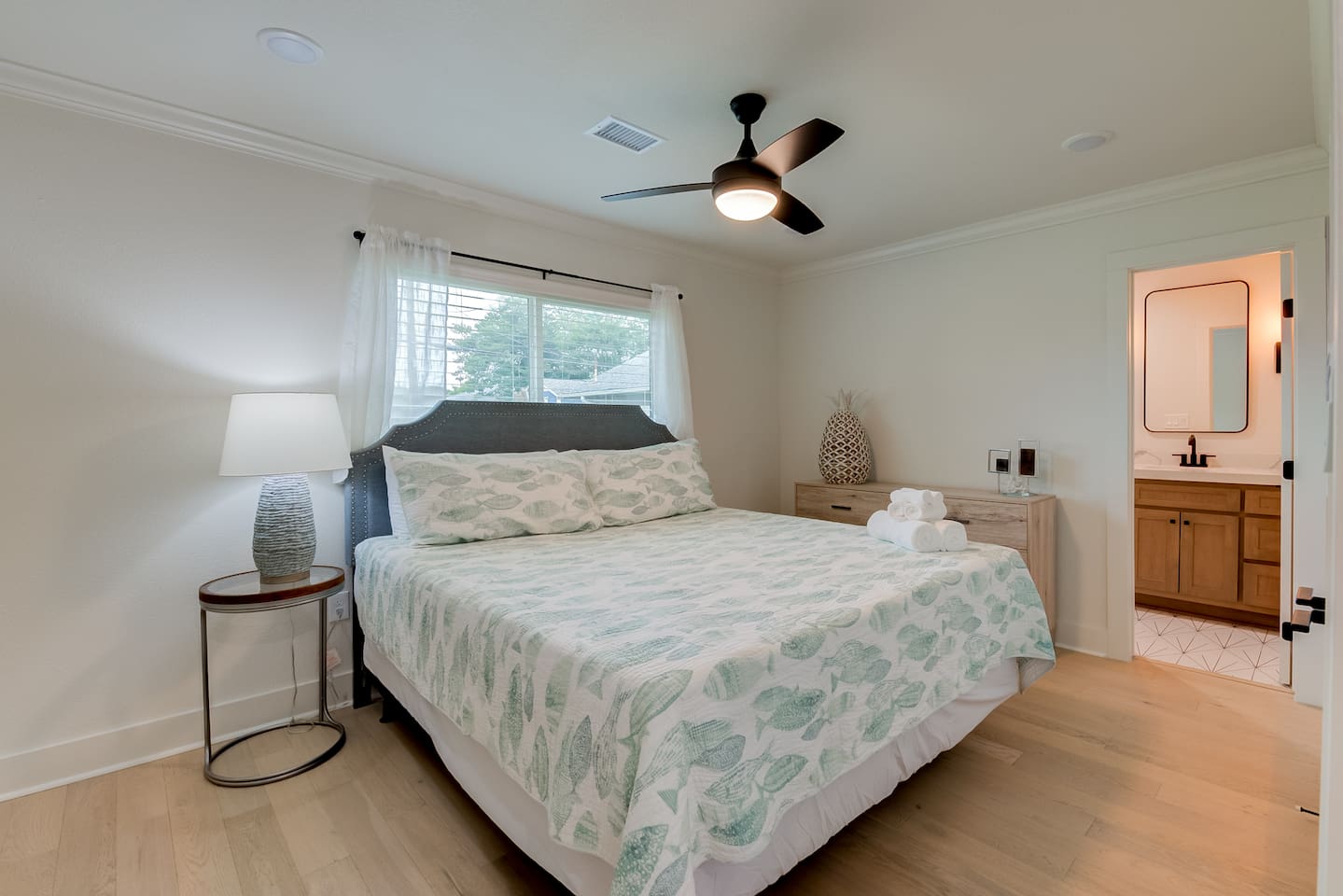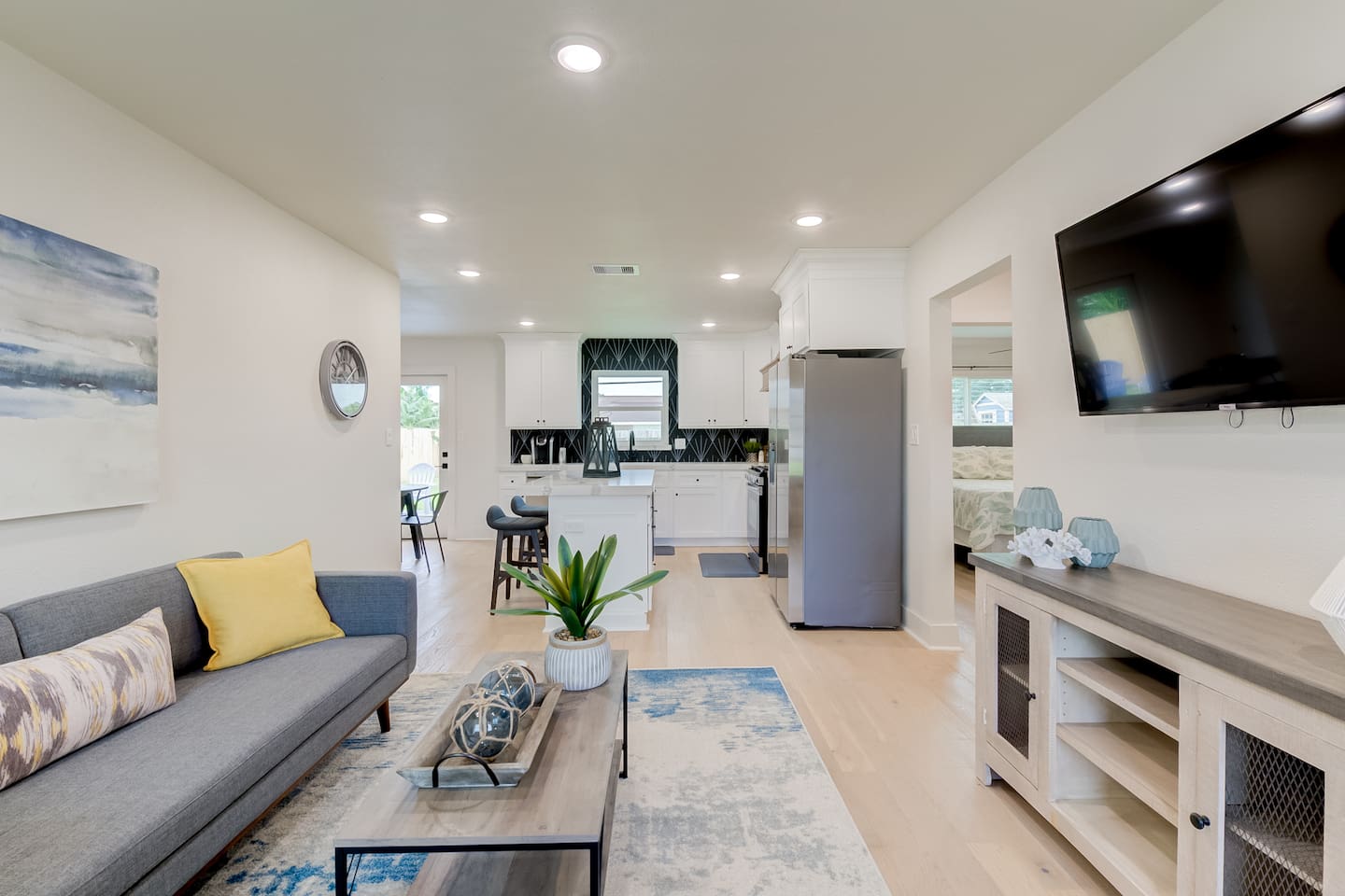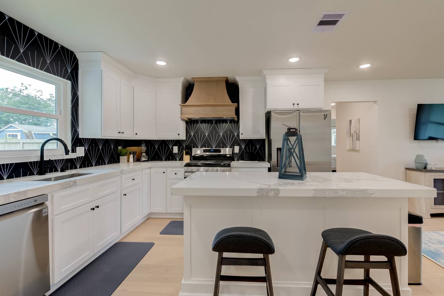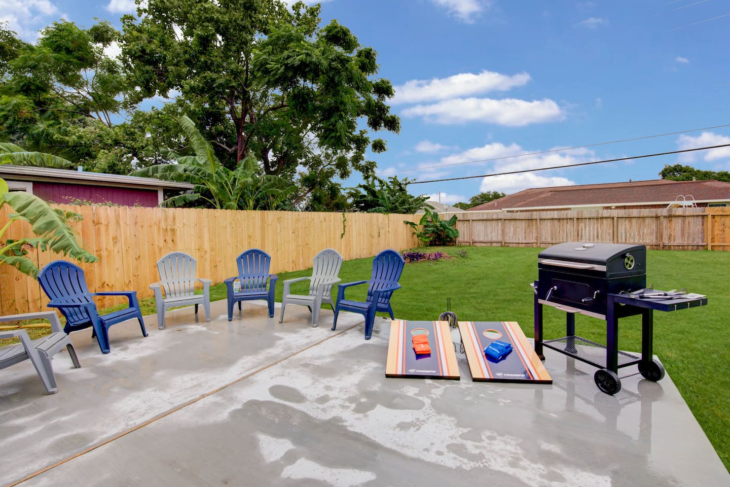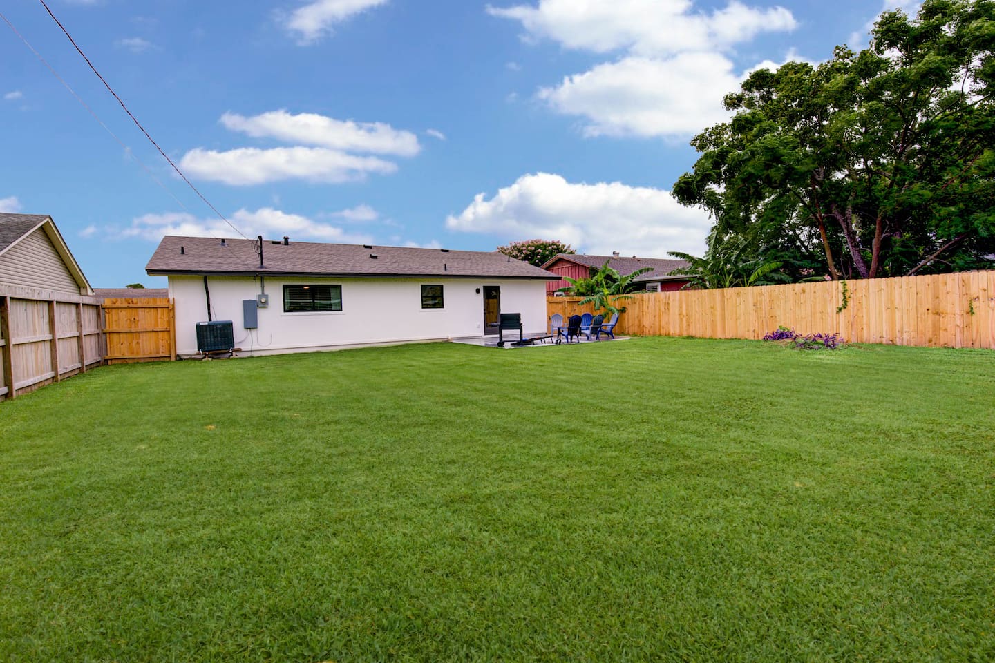 BEDROOMS Island Pride Escape generously offers 1 king bed and 2 queen beds. There are 3 bedrooms total, each with a bed of its own for your privacy. Nestle yourself into a spacious bed and drift off to a restorative night’s sleep! Each bedroom includes a closet and a dresser. The queen bedrooms include a Roku Smart TV. Strong WiFi is available throughout the house. BATHROOM There are 2 full bathrooms with a shower + tub combination, which is particularly convenient for families with small children. Enjoy steady hot water and great water pressure. Bath towels, shampoo, conditioner, body wash, hand soap, and body lotion are provided along with plenty of towels. KITCHEN A sizable island + multiple counters make this kitchen the perfect space for groups that like to cook together. Fully equipped with glasses, mugs, plates, bowls & silverware for 8. Coffee/Tea Bar includes Keurig, drip coffee maker, and electric kettle. Blender, toaster, crock pot, and microwave included. Gas stovetop range + oven. Pots/pans, baking sheet, oil, salt & pepper. DINING AREA The dining table with seating for 4 with 2 additional barstools on the island gives you eating space just off of the kitchen. LIVING ROOM Perfect for low-key nights in, our 50“ SmartTV will entertain your family as they relax and unwind on the couch and arm chair. Log in to your accounts to enjoy Netflix, HBO, Prime, Hulu, Disney+ and more. A selection of books and children's activities are provided. Pull up a yoga mat and get fit (Cardio or Strength) or relax (Meditation or Stretching) with the Peloton app. GARAGE/GAMEROOM Gather with family and friends to created lasting bonding and memories in the garage/gameroom where you'll find a ping pong table and ring/hook game as well as a 50in Roku Smart TV. OUTSIDE Fire up the barbeque on the charcoal grill in the fenced backyard while your dog enjoys the grass! We also include backyard games - cornhole and horseshoes. Space for 1 car to use garage for parking if desired as well as 1 additional parking spot on the street right in front of the house.
