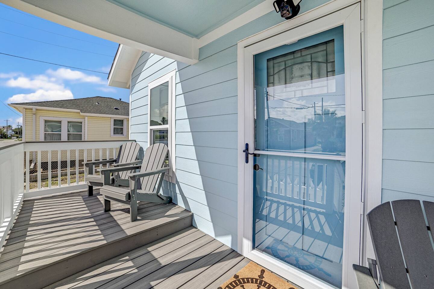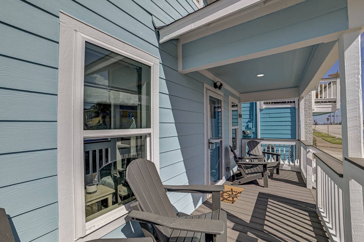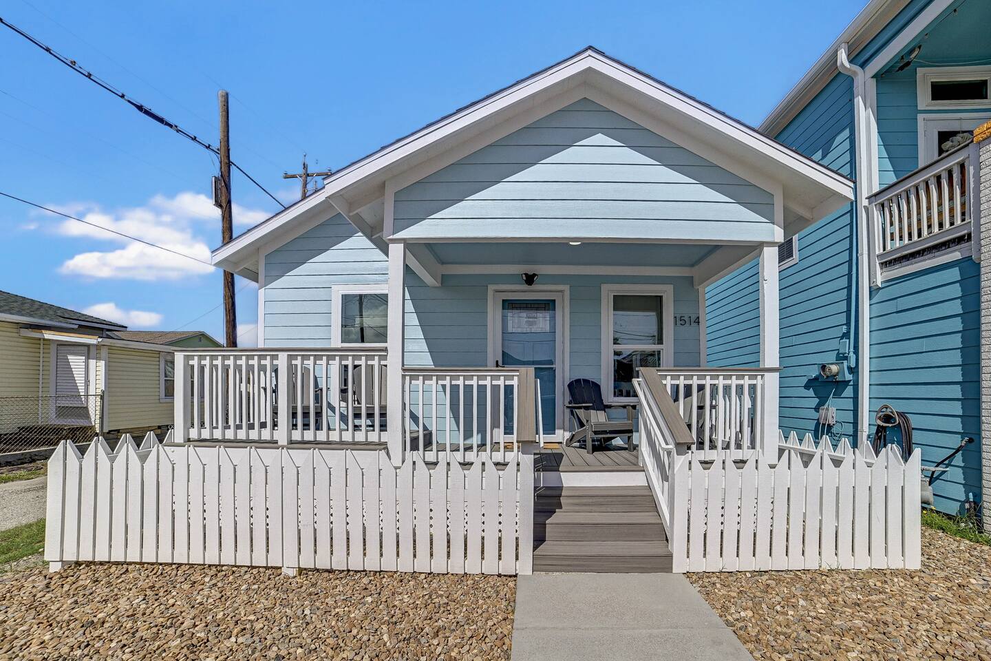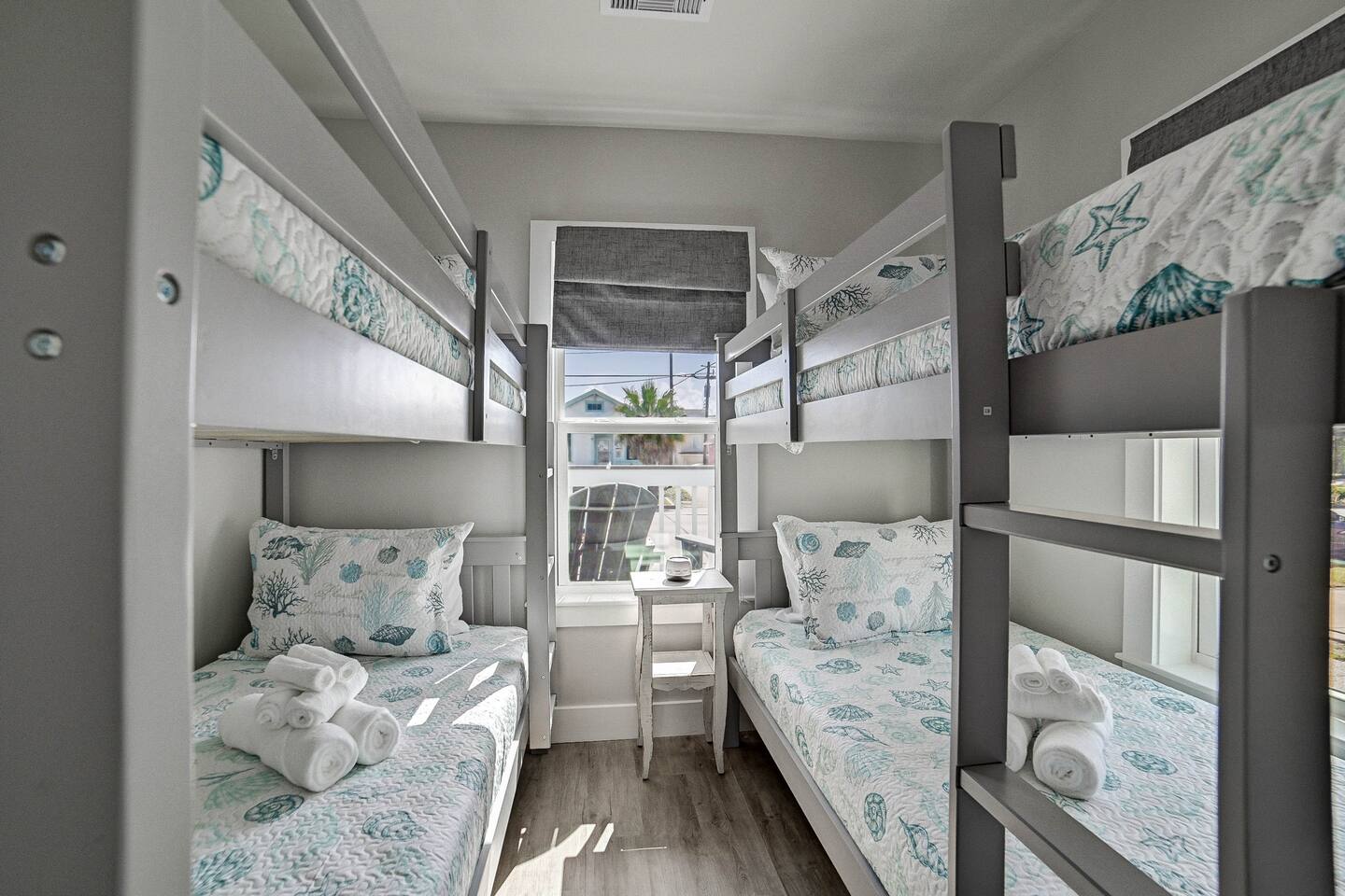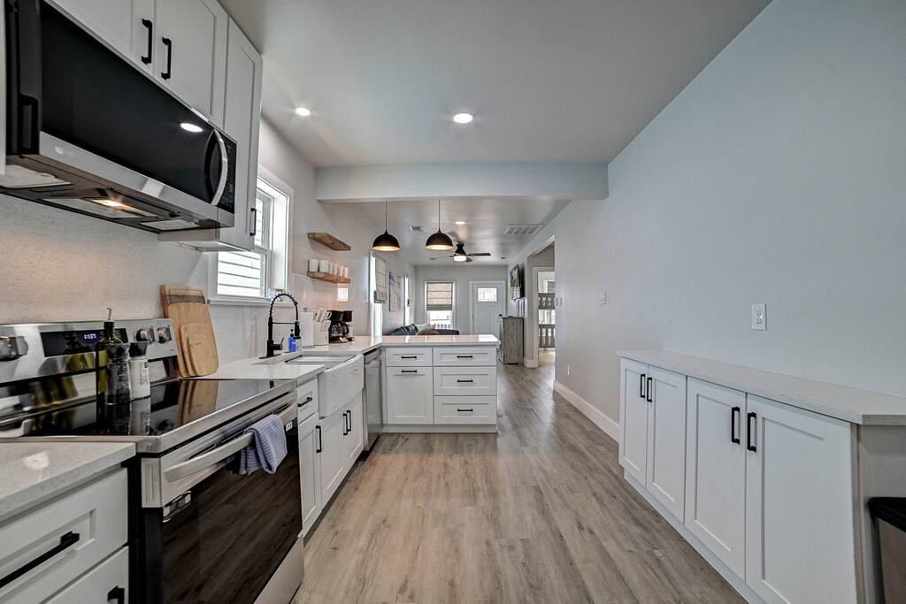 Why Guests Love Nautical Nest • Only 1 block walk to the beach & Seawall • Newly renovated with fresh coastal design • Kid-friendly bunk room for families • Relaxing front porch seating with Gulf breezes • Smart TVs in bedrooms and living room • White noise machines for restful sleep Living Space The open living room offers a comfortable place to relax after a day at the beach. Kick back with a movie on the Smart TV, enjoy the bright coastal décor, or gather with family and friends to plan your next island adventure. The kitchen is fully equipped with everything you need to prepare meals, morning coffee, or beach snacks before heading out to explore Galveston. Bedrooms Bedroom 1 • Queen bed • Smart TV • Comfortable linens and pillows Bedroom 2 • Queen bed • Smart TV • Quiet and cozy space to unwind Bunk Room • Two twin-over-twin bunk beds • Perfect for kids or groups • Fun sleeping space for younger guests Outdoor Space Enjoy the laid-back island lifestyle from the front porch, where you can relax with morning coffee or unwind after a day at the beach while feeling the Gulf breeze. Perfect For • Families visiting Galveston • Beach vacations and weekend getaways • Small groups of friends • Cruise port stays • Guests who want to walk to the beach