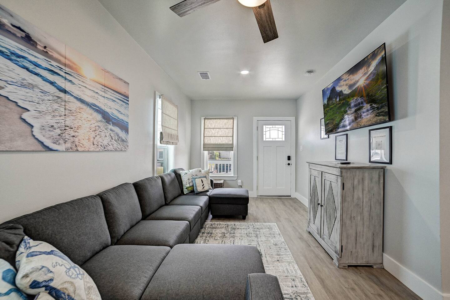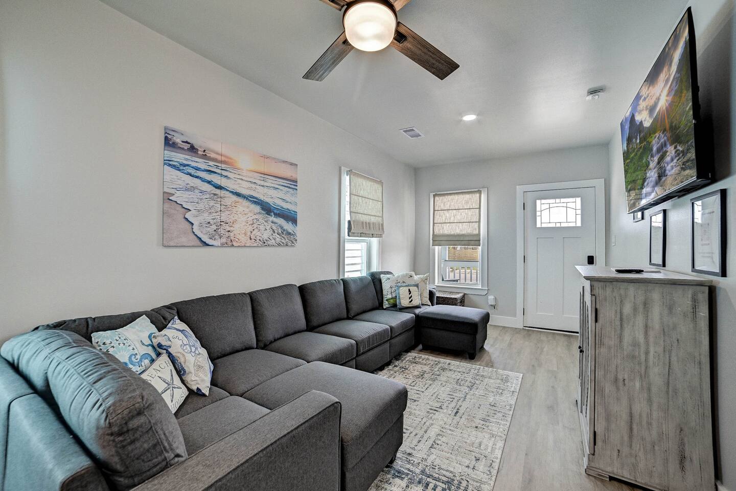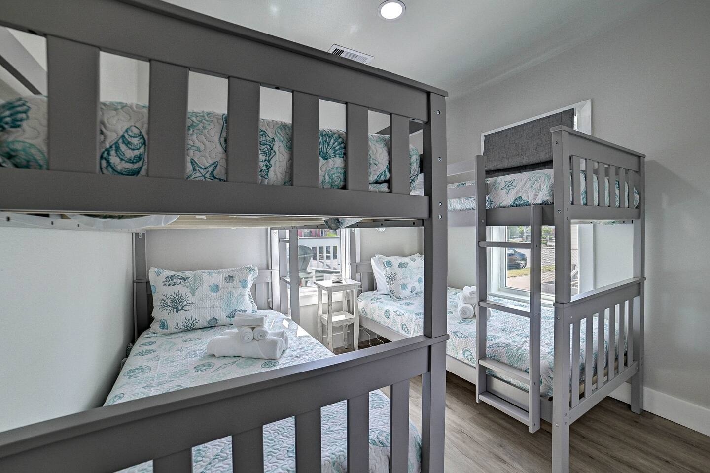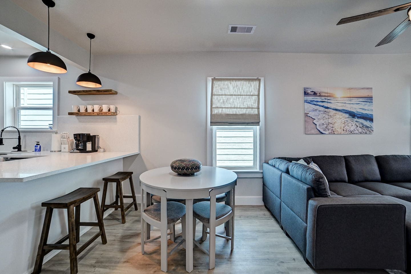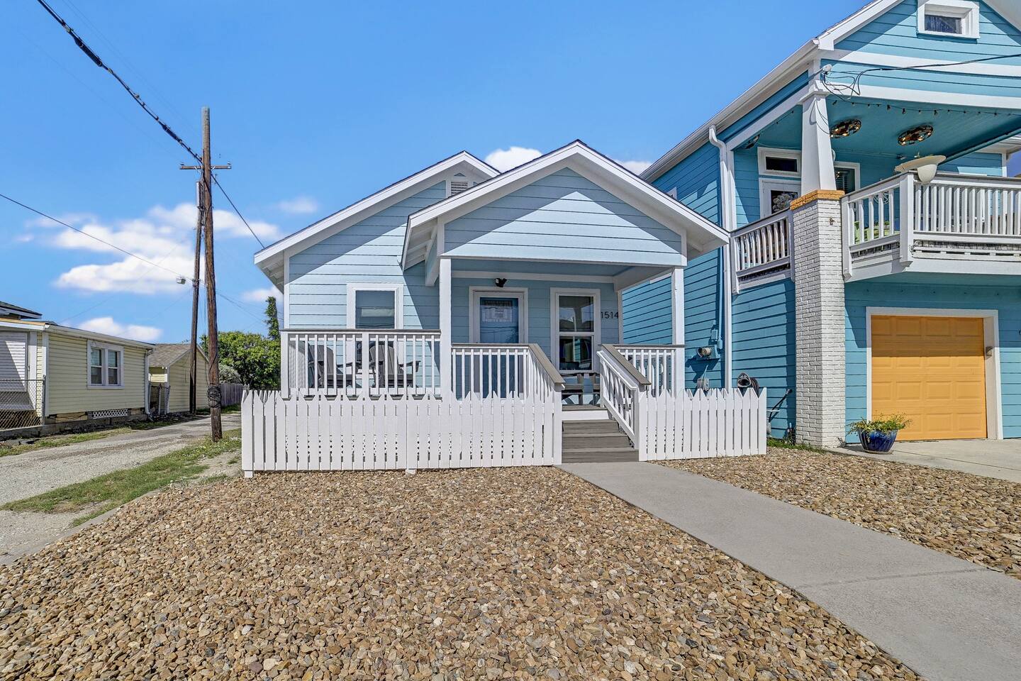 Why Guests Love Nautical Nest • Only 1 block walk to the beach & Seawall • Newly renovated with fresh coastal design • Kid-friendly bunk room for families • Relaxing front porch seating with Gulf breezes • Smart TVs in bedrooms and living room • White noise machines for restful sleep Living Space The open living room offers a comfortable place to relax after a day at the beach. Kick back with a movie on the Smart TV, enjoy the bright coastal décor, or gather with family and friends to plan your next island adventure. The kitchen is fully equipped with everything you need to prepare meals, morning coffee, or beach snacks before heading out to explore Galveston. Bedrooms Bedroom 1 • Queen bed • Smart TV • Comfortable linens and pillows Bedroom 2 • Queen bed • Smart TV • Quiet and cozy space to unwind Bunk Room • Two twin-over-twin bunk beds • Perfect for kids or groups • Fun sleeping space for younger guests Outdoor Space Enjoy the laid-back island lifestyle from the front porch, where you can relax with morning coffee or unwind after a day at the beach while feeling the Gulf breeze. Perfect For • Families visiting Galveston • Beach vacations and weekend getaways • Small groups of friends • Cruise port stays • Guests who want to walk to the beach