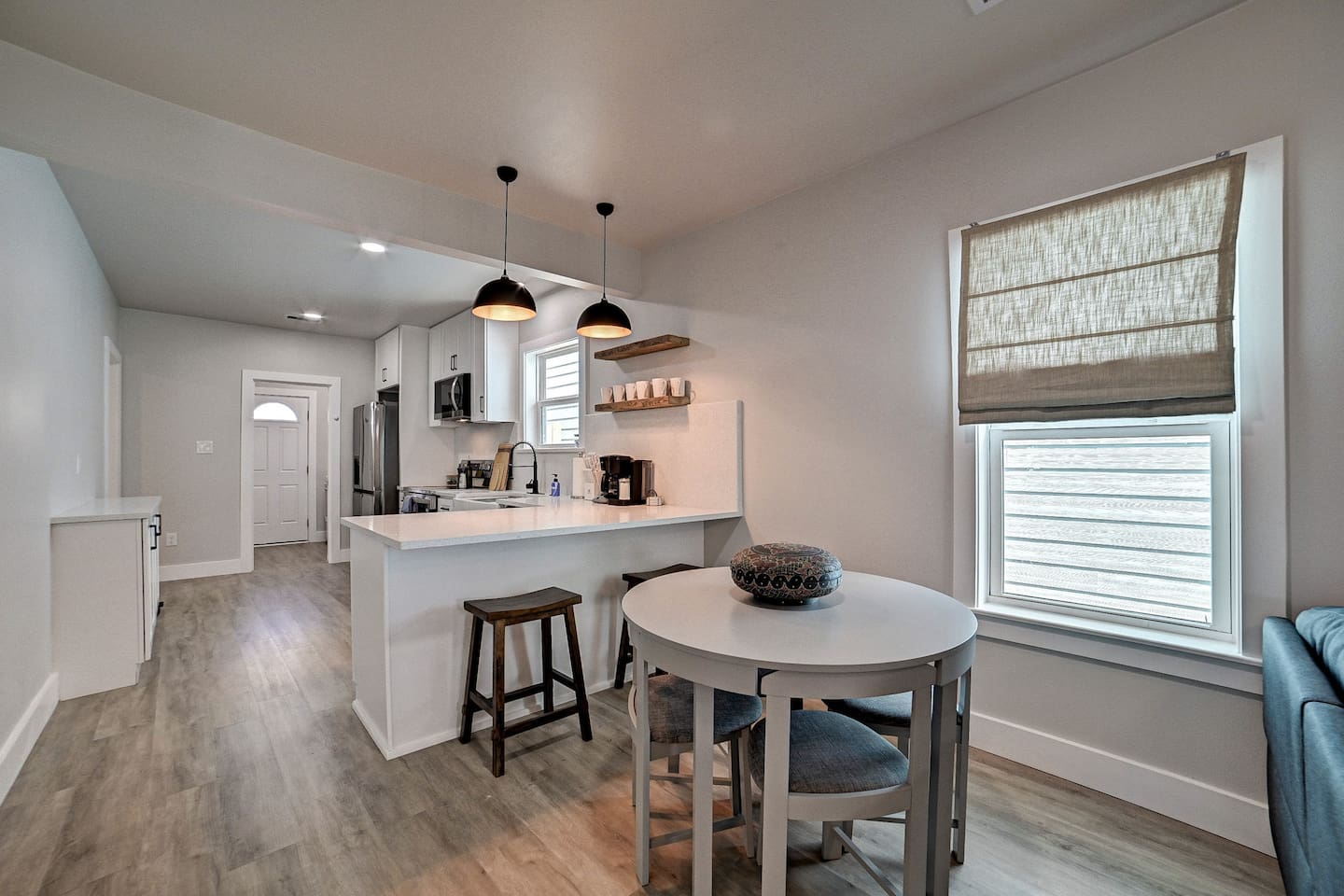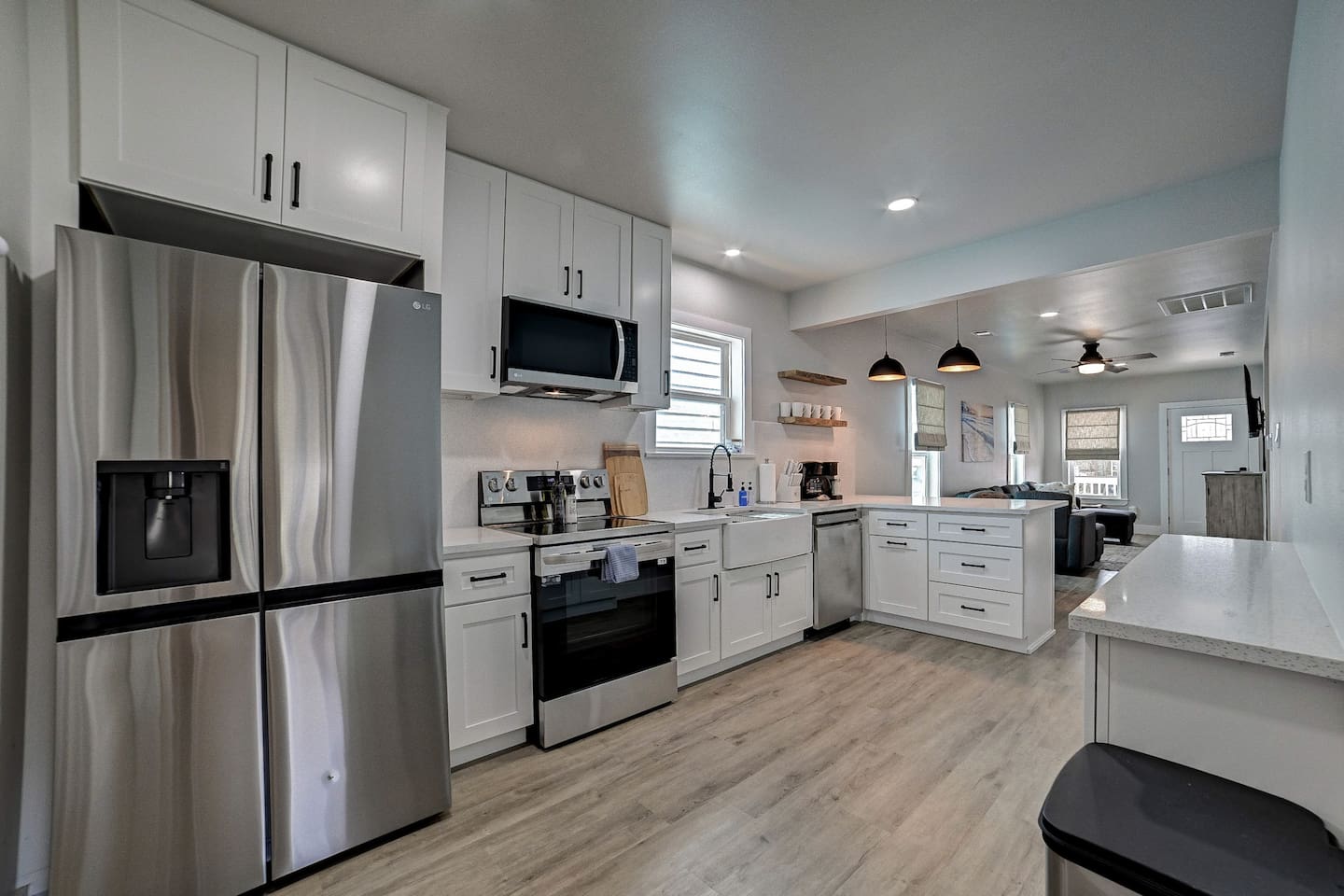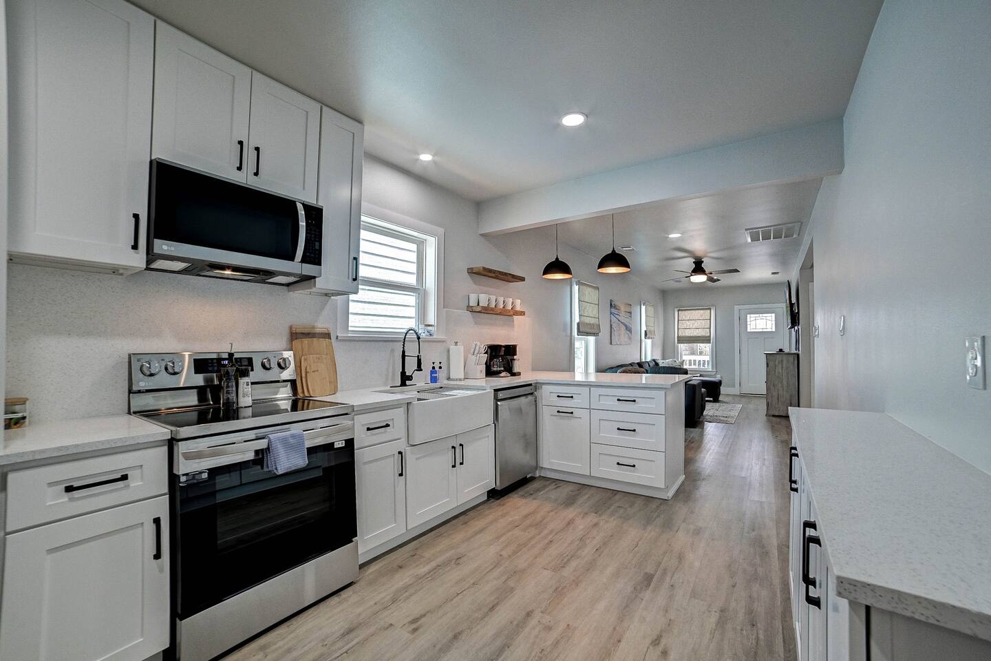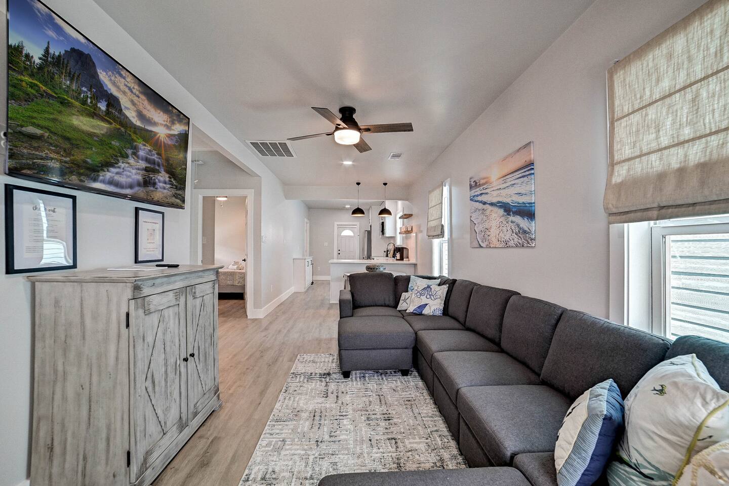 Why Guests Love Nautical Nest • Only 1 block walk to the beach & Seawall • Newly renovated with fresh coastal design • Kid-friendly bunk room for families • Relaxing front porch seating with Gulf breezes • Smart TVs in bedrooms and living room • White noise machines for restful sleep Living Space The open living room offers a comfortable place to relax after a day at the beach. Kick back with a movie on the Smart TV, enjoy the bright coastal décor, or gather with family and friends to plan your next island adventure. The kitchen is fully equipped with everything you need to prepare meals, morning coffee, or beach snacks before heading out to explore Galveston. Bedrooms Bedroom 1 • Queen bed • Smart TV • Comfortable linens and pillows Bedroom 2 • Queen bed • Smart TV • Quiet and cozy space to unwind Bunk Room • Two twin-over-twin bunk beds • Perfect for kids or groups • Fun sleeping space for younger guests Outdoor Space Enjoy the laid-back island lifestyle from the front porch, where you can relax with morning coffee or unwind after a day at the beach while feeling the Gulf breeze. Perfect For • Families visiting Galveston • Beach vacations and weekend getaways • Small groups of friends • Cruise port stays • Guests who want to walk to the beach