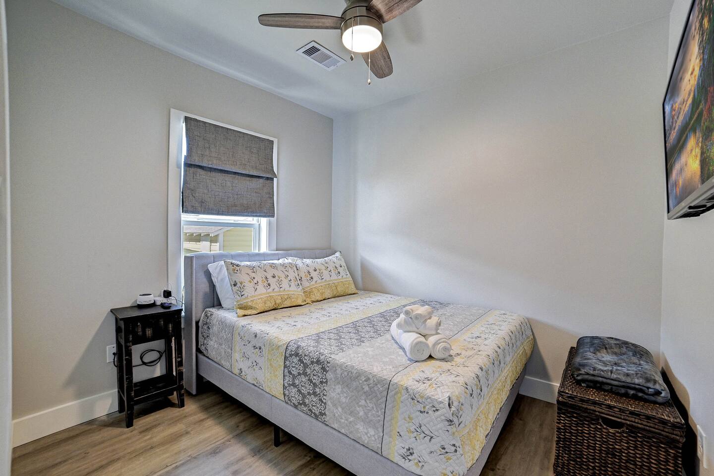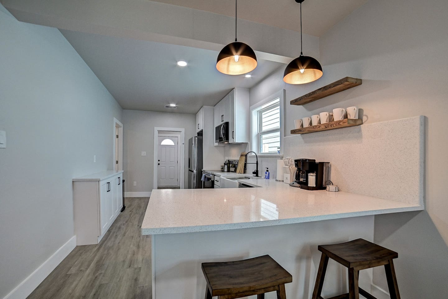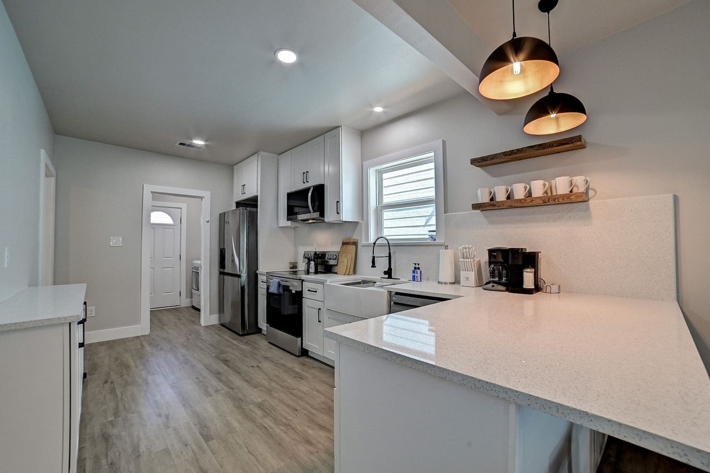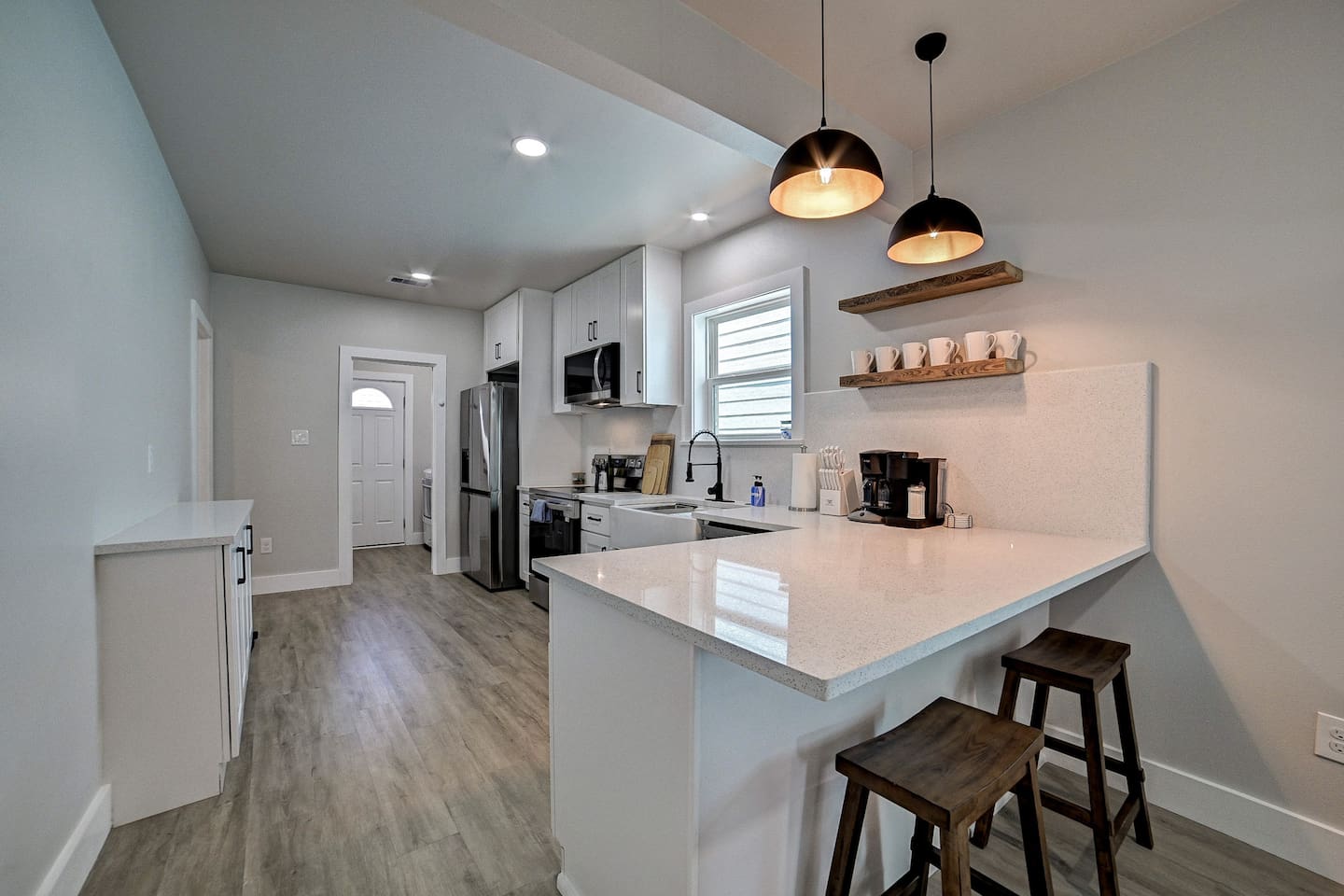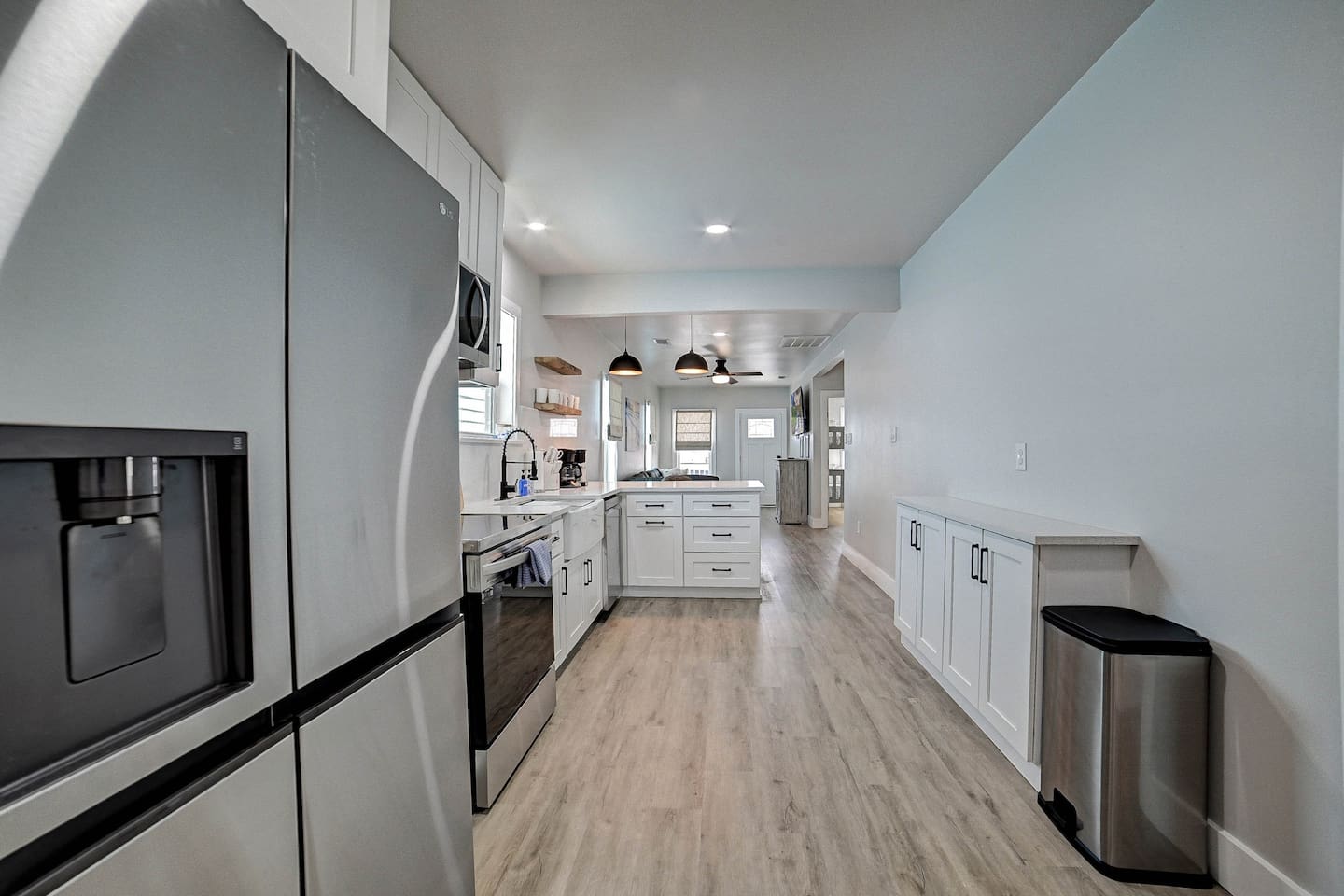 Why Guests Love Nautical Nest • Only 1 block walk to the beach & Seawall • Newly renovated with fresh coastal design • Kid-friendly bunk room for families • Relaxing front porch seating with Gulf breezes • Smart TVs in bedrooms and living room • White noise machines for restful sleep Living Space The open living room offers a comfortable place to relax after a day at the beach. Kick back with a movie on the Smart TV, enjoy the bright coastal décor, or gather with family and friends to plan your next island adventure. The kitchen is fully equipped with everything you need to prepare meals, morning coffee, or beach snacks before heading out to explore Galveston. Bedrooms Bedroom 1 • Queen bed • Smart TV • Comfortable linens and pillows Bedroom 2 • Queen bed • Smart TV • Quiet and cozy space to unwind Bunk Room • Two twin-over-twin bunk beds • Perfect for kids or groups • Fun sleeping space for younger guests Outdoor Space Enjoy the laid-back island lifestyle from the front porch, where you can relax with morning coffee or unwind after a day at the beach while feeling the Gulf breeze. Perfect For • Families visiting Galveston • Beach vacations and weekend getaways • Small groups of friends • Cruise port stays • Guests who want to walk to the beach