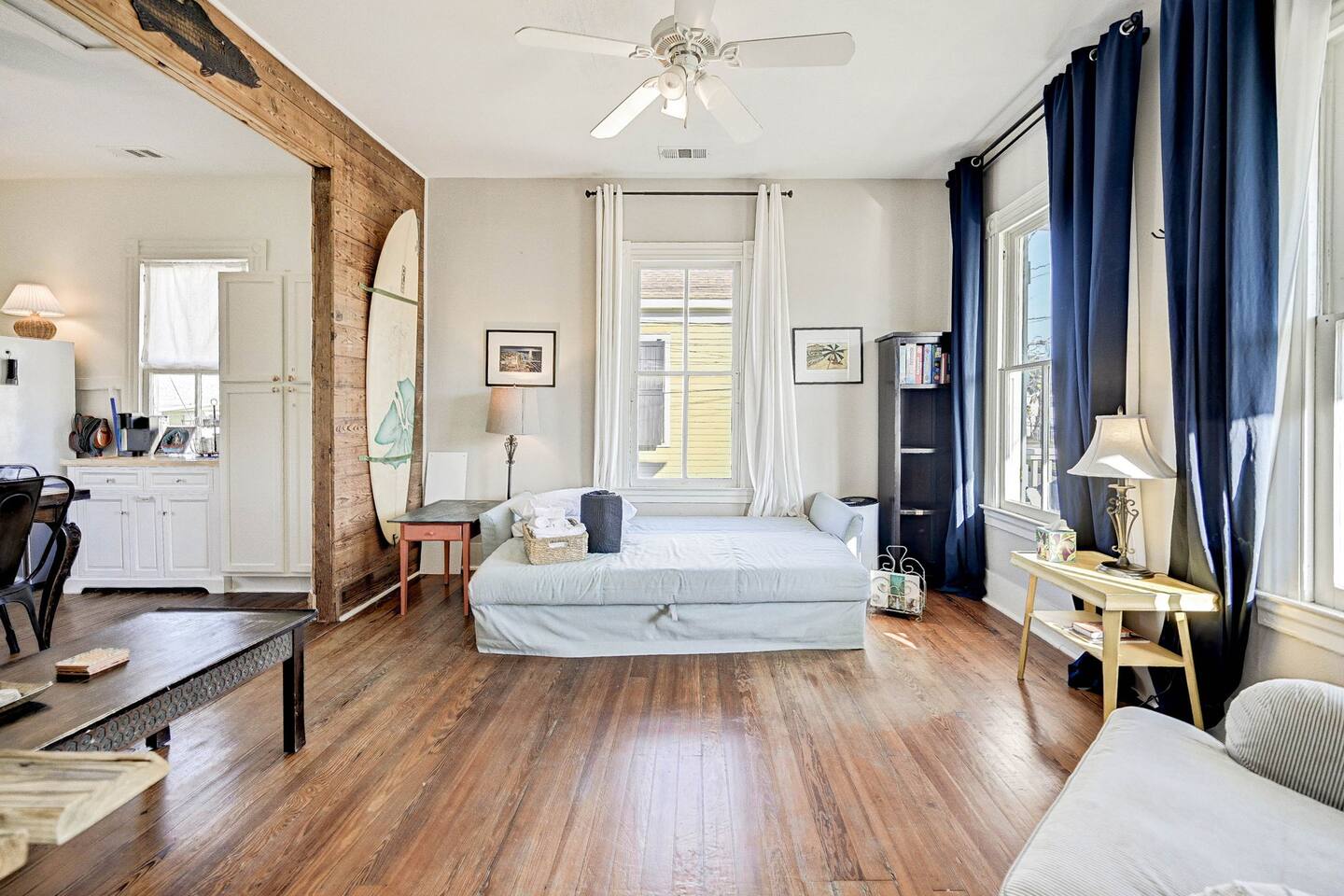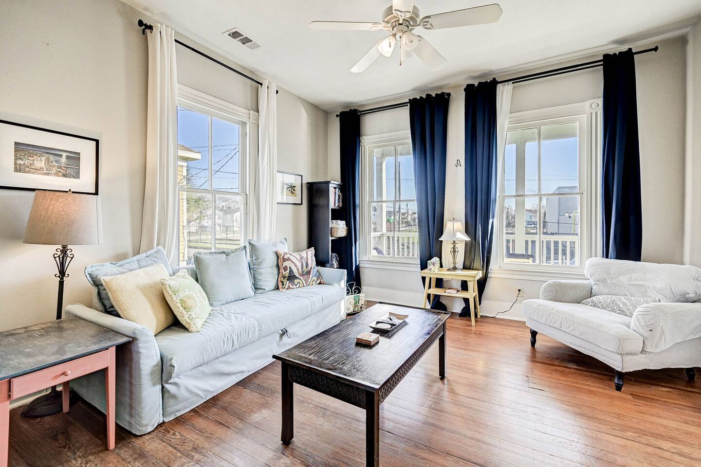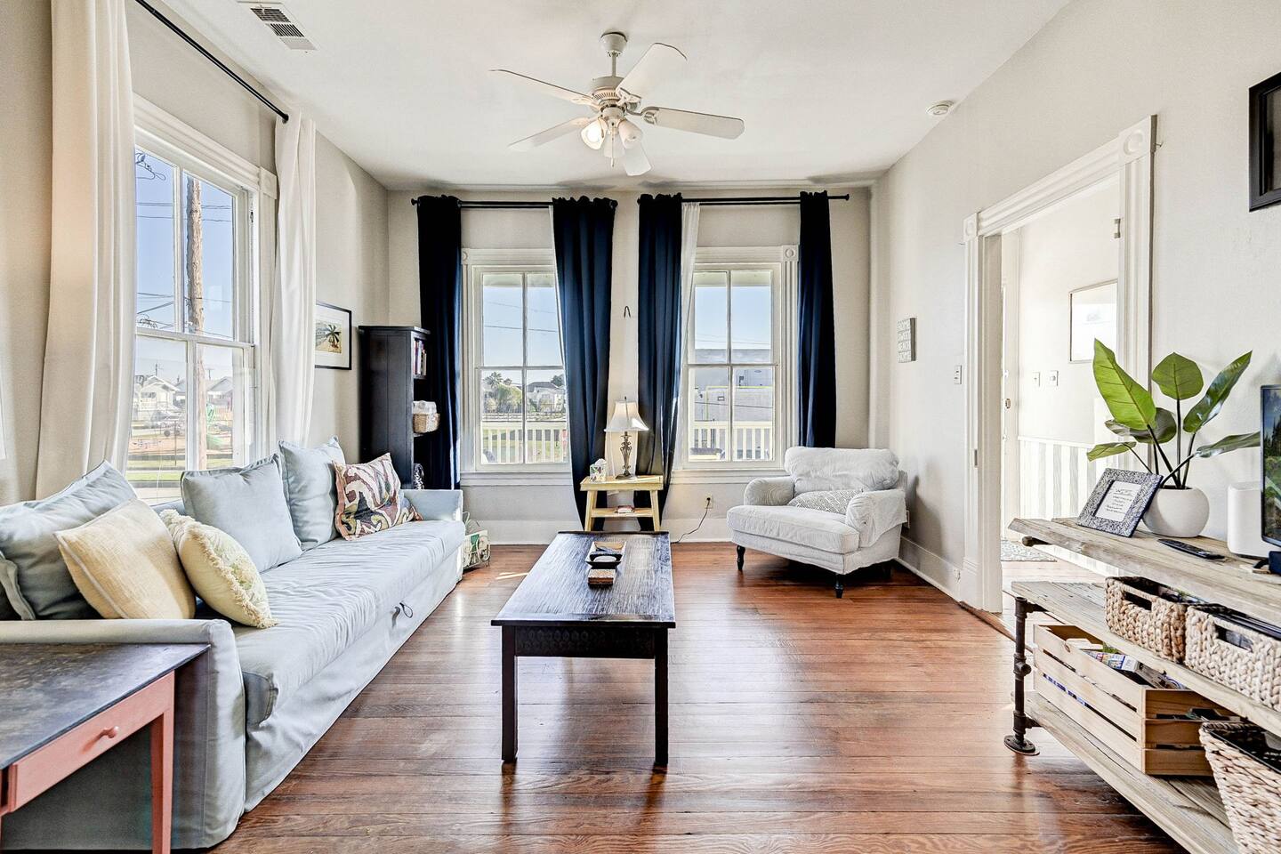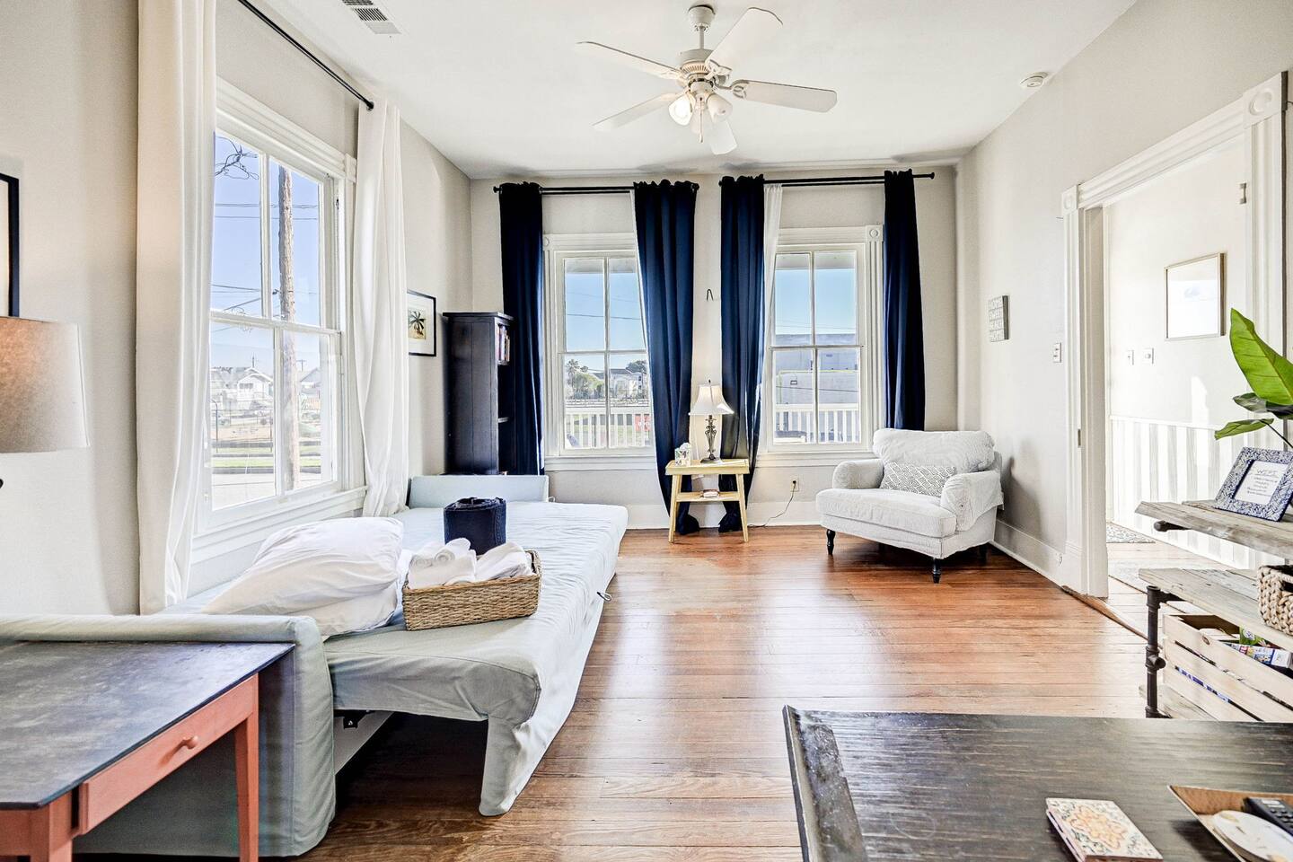 Enjoy your morning coffee on the front porch with the Gulf breeze, spend the day exploring the beach, and unwind in the evening grilling in the private fenced backyard. Why Guests Love The Happy Hut • Historic 1910 beach cottage full of island charm • Easy walk to the beach & Seawall • Perfect for couples or small families • Front porch seating for morning coffee • Fenced backyard + charcoal grill • Outdoor shower for rinsing off after beach days • Dedicated workspace with strong WiFi • Pet-friendly yard for your dog Living Space The bright and comfortable living room is perfect for relaxing after a day exploring Galveston. Stream your favorite shows on the Smart TV, curl up with a book, or enjoy board games and family time in the cozy living area. A sofa bed provides additional sleeping space for extra guests. Bedroom The bedroom offers a comfortable queen bed with soft linens and room-darkening shades, helping ensure a restful night’s sleep after beach days and island adventures. Extra pillows, blankets, and storage space are provided for your comfort. Kitchen & Dining The fully equipped kitchen includes everything you need for preparing meals during your stay. Features include: • Gas stovetop + oven • Dishwasher • Drip coffee maker, Keurig, and electric kettle • Blender, toaster, and microwave • Cookware, dishes, and utensils for four guests The dining table comfortably seats four. Bathroom The bathroom features a classic clawfoot tub with shower, combining historic charm with modern comfort. Fresh towels, shampoo, conditioner, body wash, and other essentials are provided. Outdoor Space Relax and enjoy the island breeze in two outdoor spaces: Front Porch • Perfect for morning coffee or evening drinks Backyard • Fenced yard for dogs • Charcoal grill for cookouts • Outdoor shower to rinse off after beach days Perfect For • Couples visiting Galveston • Small families • Weekend beach getaways • Guests bringing a dog • Remote workers needing a workspace