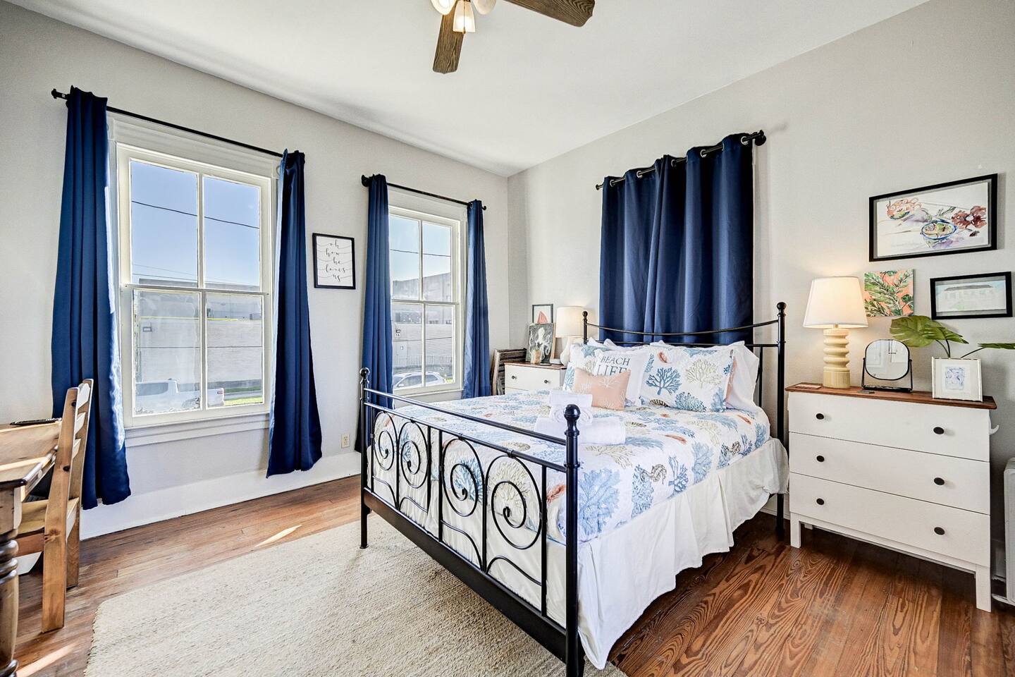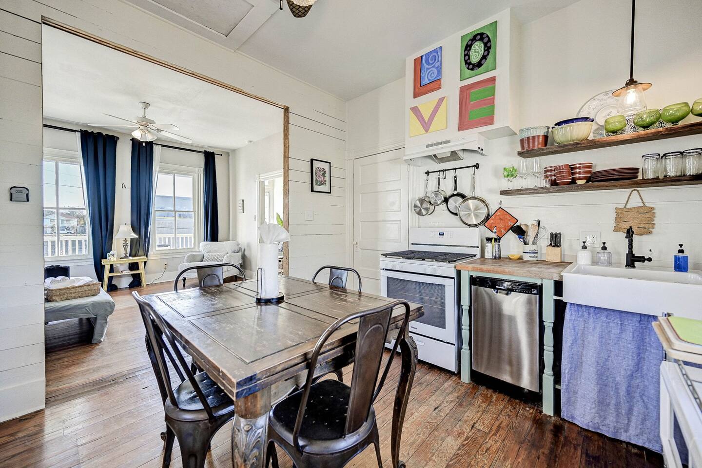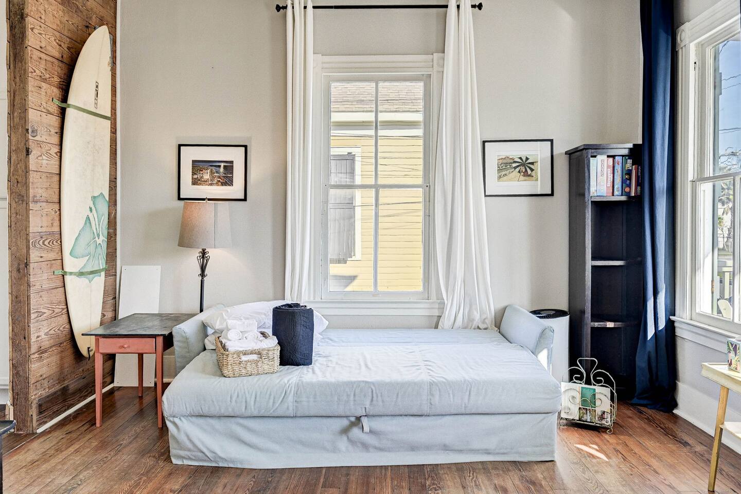 Enjoy your morning coffee on the front porch with the Gulf breeze, spend the day exploring the beach, and unwind in the evening grilling in the private fenced backyard. Why Guests Love The Happy Hut • Historic 1910 beach cottage full of island charm • Easy walk to the beach & Seawall • Perfect for couples or small families • Front porch seating for morning coffee • Fenced backyard + charcoal grill • Outdoor shower for rinsing off after beach days • Dedicated workspace with strong WiFi • Pet-friendly yard for your dog Living Space The bright and comfortable living room is perfect for relaxing after a day exploring Galveston. Stream your favorite shows on the Smart TV, curl up with a book, or enjoy board games and family time in the cozy living area. A sofa bed provides additional sleeping space for extra guests. Bedroom The bedroom offers a comfortable queen bed with soft linens and room-darkening shades, helping ensure a restful night’s sleep after beach days and island adventures. Extra pillows, blankets, and storage space are provided for your comfort. Kitchen & Dining The fully equipped kitchen includes everything you need for preparing meals during your stay. Features include: • Gas stovetop + oven • Dishwasher • Drip coffee maker, Keurig, and electric kettle • Blender, toaster, and microwave • Cookware, dishes, and utensils for four guests The dining table comfortably seats four. Bathroom The bathroom features a classic clawfoot tub with shower, combining historic charm with modern comfort. Fresh towels, shampoo, conditioner, body wash, and other essentials are provided. Outdoor Space Relax and enjoy the island breeze in two outdoor spaces: Front Porch • Perfect for morning coffee or evening drinks Backyard • Fenced yard for dogs • Charcoal grill for cookouts • Outdoor shower to rinse off after beach days Perfect For • Couples visiting Galveston • Small families • Weekend beach getaways • Guests bringing a dog • Remote workers needing a workspace