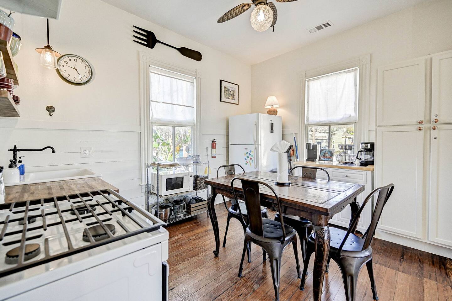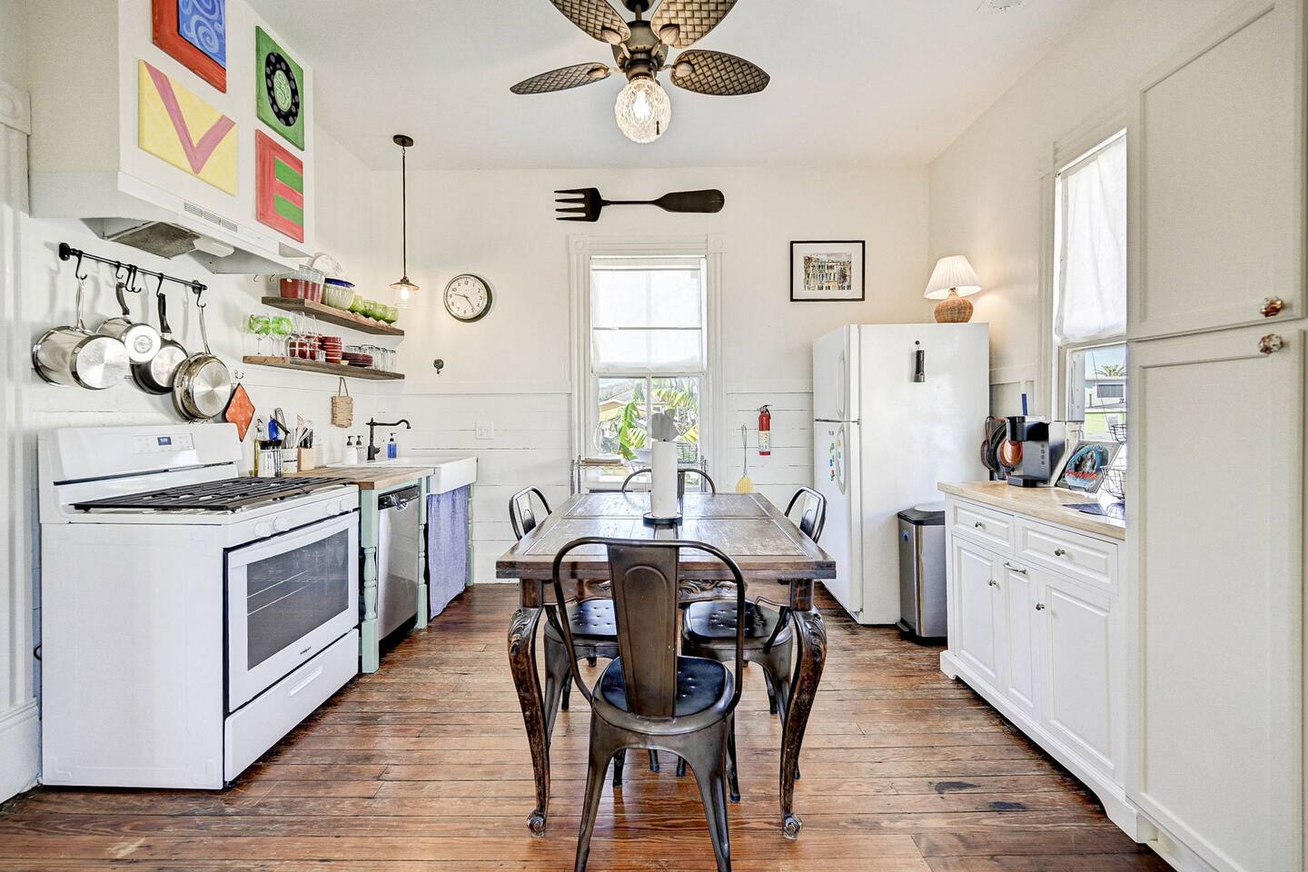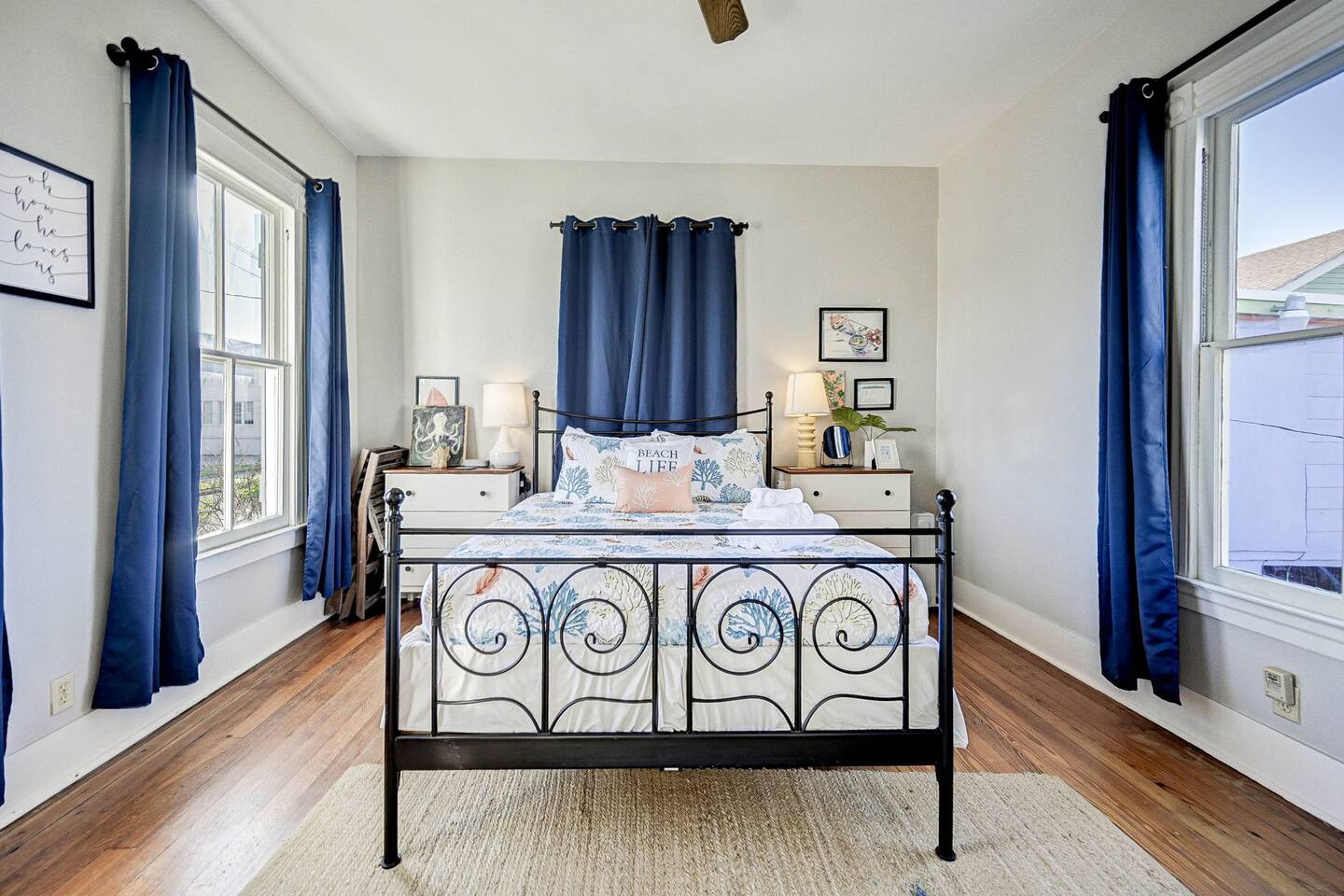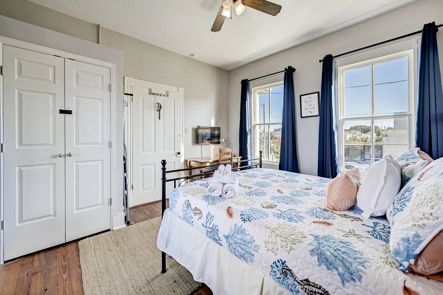 Enjoy your morning coffee on the front porch with the Gulf breeze, spend the day exploring the beach, and unwind in the evening grilling in the private fenced backyard. Why Guests Love The Happy Hut • Historic 1910 beach cottage full of island charm • Easy walk to the beach & Seawall • Perfect for couples or small families • Front porch seating for morning coffee • Fenced backyard + charcoal grill • Outdoor shower for rinsing off after beach days • Dedicated workspace with strong WiFi • Pet-friendly yard for your dog Living Space The bright and comfortable living room is perfect for relaxing after a day exploring Galveston. Stream your favorite shows on the Smart TV, curl up with a book, or enjoy board games and family time in the cozy living area. A sofa bed provides additional sleeping space for extra guests. Bedroom The bedroom offers a comfortable queen bed with soft linens and room-darkening shades, helping ensure a restful night’s sleep after beach days and island adventures. Extra pillows, blankets, and storage space are provided for your comfort. Kitchen & Dining The fully equipped kitchen includes everything you need for preparing meals during your stay. Features include: • Gas stovetop + oven • Dishwasher • Drip coffee maker, Keurig, and electric kettle • Blender, toaster, and microwave • Cookware, dishes, and utensils for four guests The dining table comfortably seats four. Bathroom The bathroom features a classic clawfoot tub with shower, combining historic charm with modern comfort. Fresh towels, shampoo, conditioner, body wash, and other essentials are provided. Outdoor Space Relax and enjoy the island breeze in two outdoor spaces: Front Porch • Perfect for morning coffee or evening drinks Backyard • Fenced yard for dogs • Charcoal grill for cookouts • Outdoor shower to rinse off after beach days Perfect For • Couples visiting Galveston • Small families • Weekend beach getaways • Guests bringing a dog • Remote workers needing a workspace